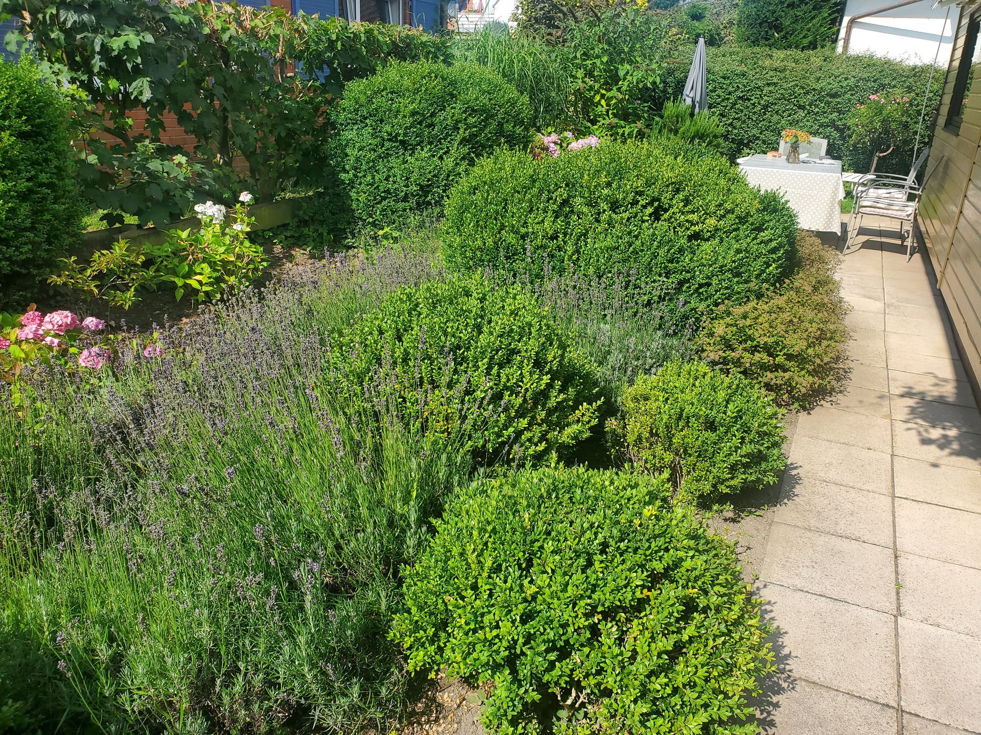 Auf der großen Terrasse, die von einer grünen Pracht umrahmt wird, kann von Sonnenaufgang bis Sonnenuntergang die Sonne genossen werden. Eine Markise spendet bei Bedarf Schatten.